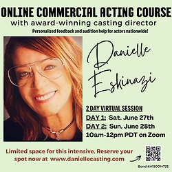 ADULT COMMERCIAL ACTING CLASS 18+ Dates: June 27th & June 28th *Early Bird Pricing Discount ends 5/27/26 What this class includes: DAY ONE 10am-12pm Danielle will open with a Q&A, followed by cold readings and personality slates. She will then work with you individually the same way a director would, changing instructions quickly to see how well you can think on your feet while grounding yourself and making your reading as authentic as possible. We'll then focus on your improvisational skills as a performer, using comedy spots and reading in groups, Danielle will take this time to help you bring your most genuine self to the audition. We will also cover writing your very own 30 second spot to really get into the mind of the script. DAY TWO 10am-12pm Danielle will cover self-tape protocol and will also work on long-form pharmaceutical commercial copy, the goal being to provide you with relevant experience and insight into one of the most common and lucrative forms of commercial auditions today. Every student will get one-on-one time with Danielle, where you will be able to talk through what your sticking points or blocks are and how to move forward. ------------------------------------------------------------------------------------ IMPORTANT: If you'd like to sign up for this class, please fill out and send the following contract to danielleclasses@gmail.com to protect you as a consumer. https://drive.google.com/file/d/1PA0lMQQHe84E3YmAK9KPh5OPk75IvQso/view?usp=share_link In accordance with California Code, Labor Code - LAB § 1703 You may cancel this contract and obtain a full refund, without any penalty or obligation, if notice of cancellation is given, in writing, within 10 business days from the above date or the date on which you commence utilizing the services under the contract, whichever is longer. For purposes of this section, business days are Monday through Friday. ------------------------------------------------------------------------------------ Once you sign up for class and complete payment, please check your email confirmation for the zoom link and the class materials google drive link which which is released June 10th (so you have ample time to prepare).